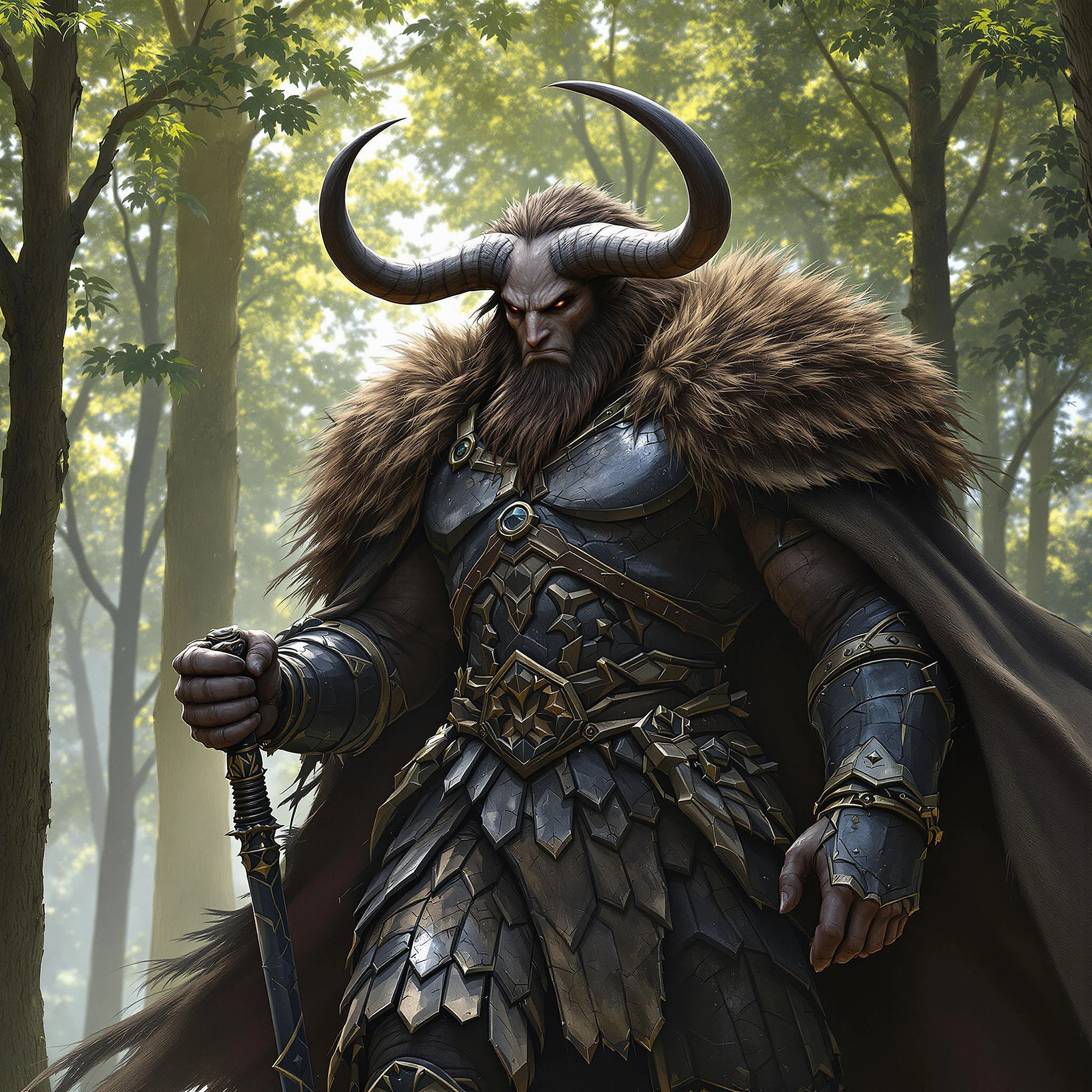 A minotaur warrior, his face with humanoid features, clad in battered black armor. His fur-lined cloak billows behind him as he walks imposingly. He wields a colossal beak as a weapon, which he holds in both hands. He highlights the details of his implacable expression to convey a sense of serenity. Trees stand tall where sunlight streams through the leaves.