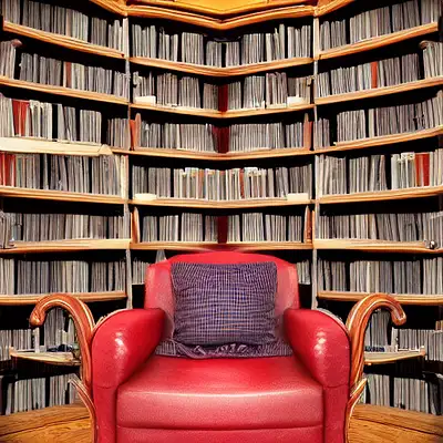 A bookshelf full of books about cloud native (kubernetes, docker) technology, old english library style. Morpheus with a red hat is reading in leather armchair, high res.