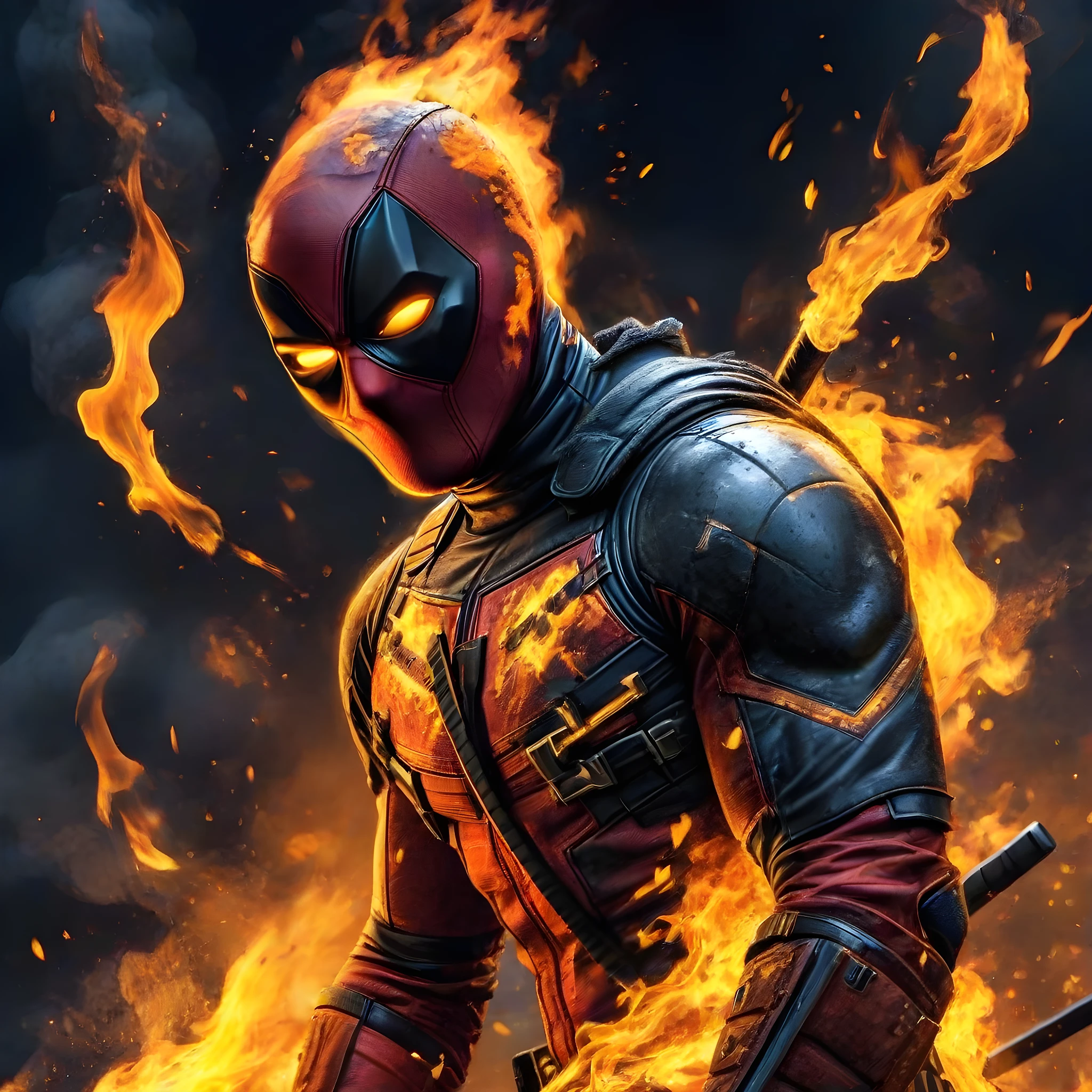 Vengeance Deadpool, Digital art, Modern era, Utilization of vibrant oranges and yellows against a dark background to convey a dynamic and fiery appearance. The image exhibits a high level of detail with an emphasis on textures that mimic the look of burning and charred materials
