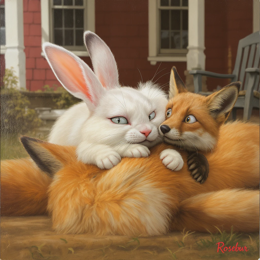a highly detailed realistic humorous image of a cross-eyed white rabbit with a sly grin lying on top of a fox with her claws in him. The surprised fox looks up at the cat with an air of real confusion. There is a red-shingled house with a porch chair out front behind them. In oil paint. With small font text 'Rosebur' in lower right corner.