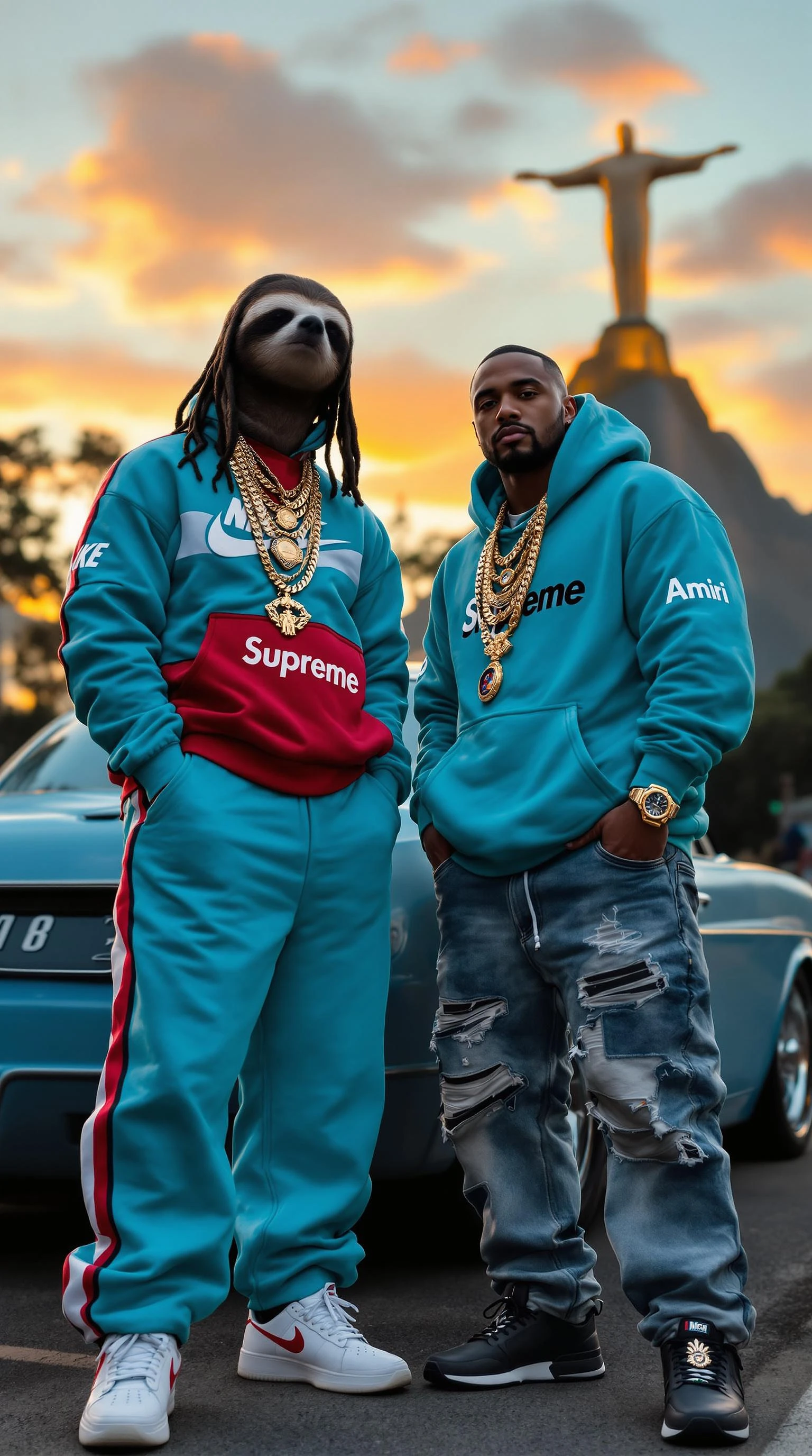 Two men with a rich favela hustler aesthetic, blending sportswear and luxury. The sloth-headed man wears a Nike Tech Fleece tracksuit with heavy gold chains, while his partner flexes a Supreme hoodie, Amiri jeans, and a Hublot watch. They stand beside a custom lowrider in the streets of Rio, with the Christ the Redeemer statue visible in the background, glowing under the sunsetc