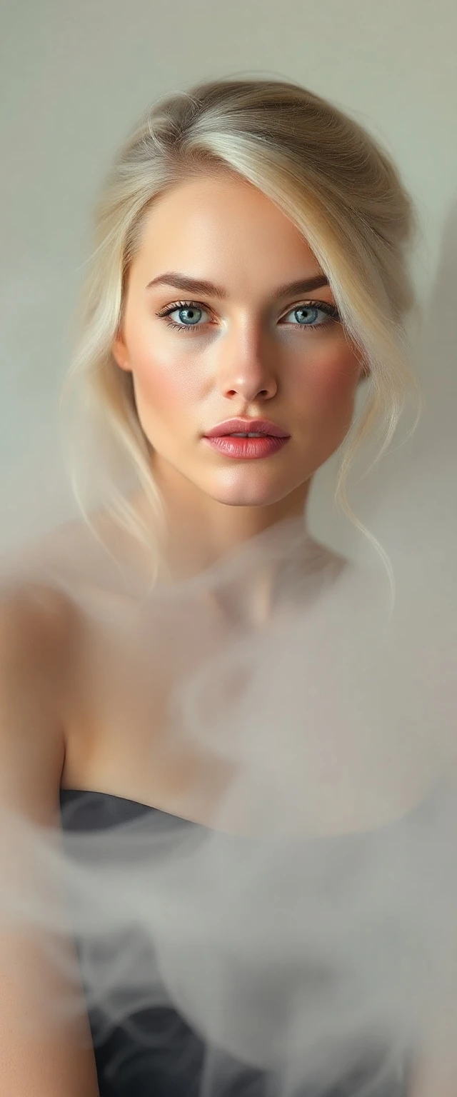 "Fine art photograph. full body image. A blonde supermodel woman in her early twenties, Refined facial features, graceful and elegant, amidst swirling mist. Soft pastel colours, medium visibility. Modernist aesthetic, soft contrast, gentle and soothing. Professional photography. "