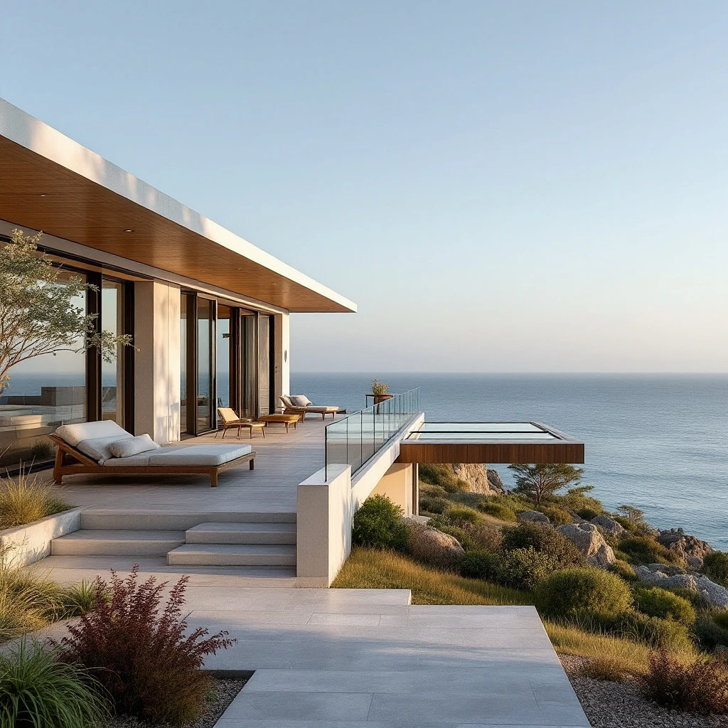 Hyper realistic eye level exterior photo of a mid century modern style house overlooking the ocean, daylight, indirect lighting, AD magazine, Frank Lloyd, Eames, Mies van der Rohe