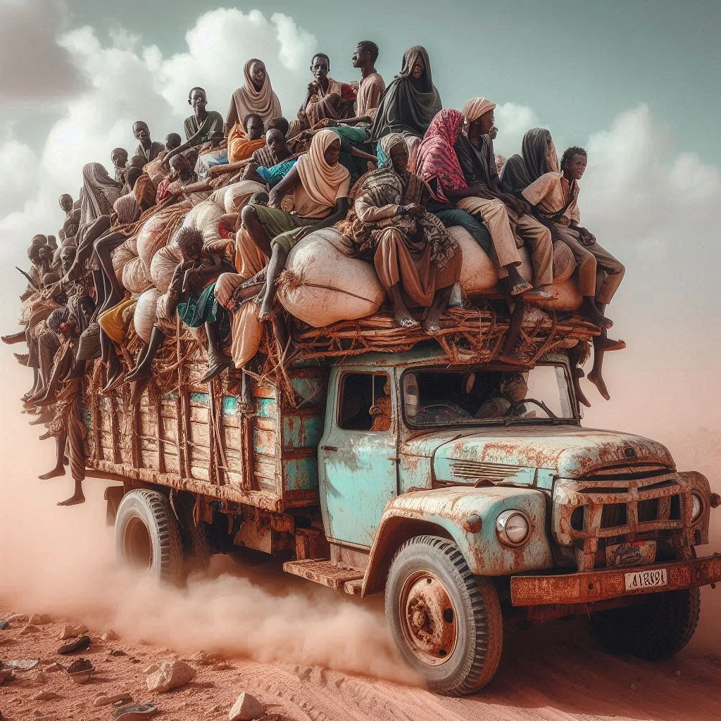 A dusty battered truck in northern Africa, overloaded, people sitting on top. Impressive desert scenery, wide angle, low horizon. NatGeo photography