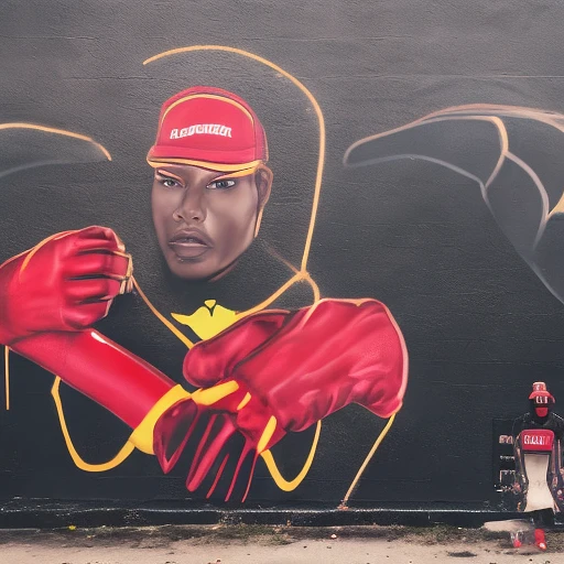 A black man in a red metallic superhero suit with gold gloves and yellow boots, black sunglasses with a red backwards baseball cap and holding two spraycans in front of a black wall with graffiti with the word ZOZ.