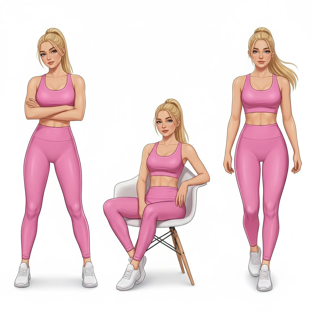 A highly detailed and hyper-realistic full-body digital illustration of a 18-year-old blonde woman with a beautiful face, a charming smile, and sleek ponytail. She has photorealistic skin texture and expressive eyes, wearing a pink, form-fitting athletic or professional outfit. The character is depicted in multiple dynamic poses: standing confidently with arms crossed, sitting gracefully on a chair, and walking forward with a purposeful stride. Consistent lighting and colors, with a focus on realistic proportions and preserving facial details. The background is a clean white studio setting with soft, even lighting that emphasizes the subject's features and textures.