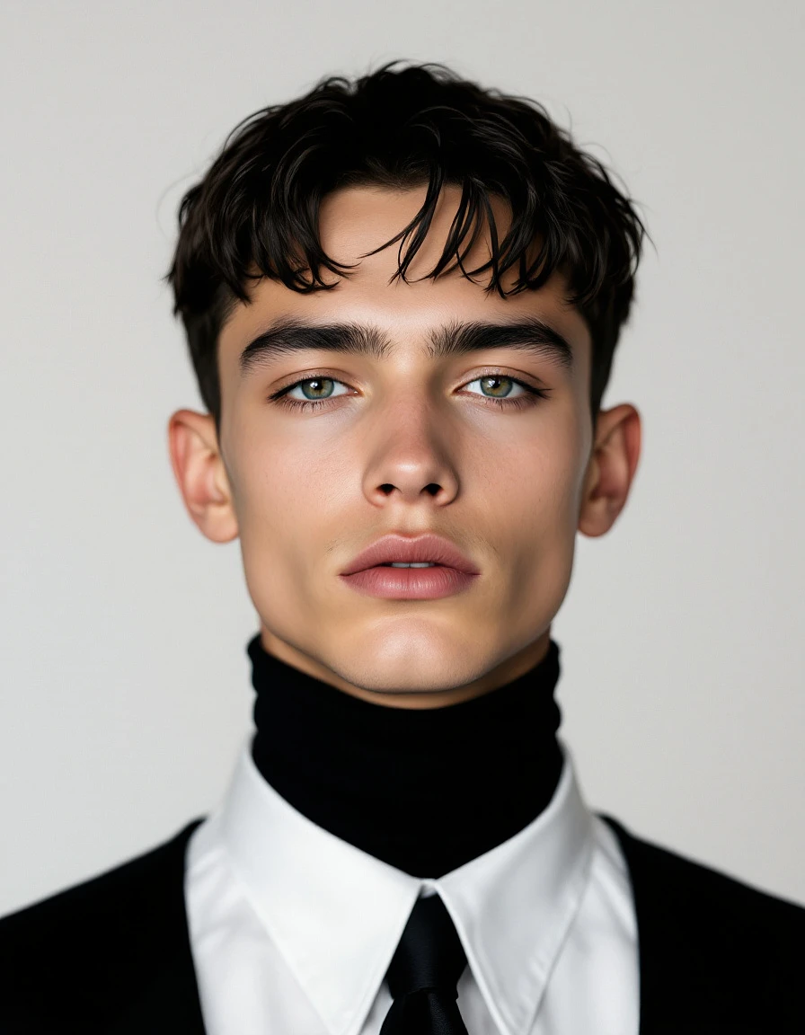 Symetrical ultra Closeup of a model boy with a stunning face, dark ferragamo outfit, Minimalistic studio backdrop, by bottega veneta --ar 9:16 --personalize akiqp5w --stylize 300 --v 6. 1