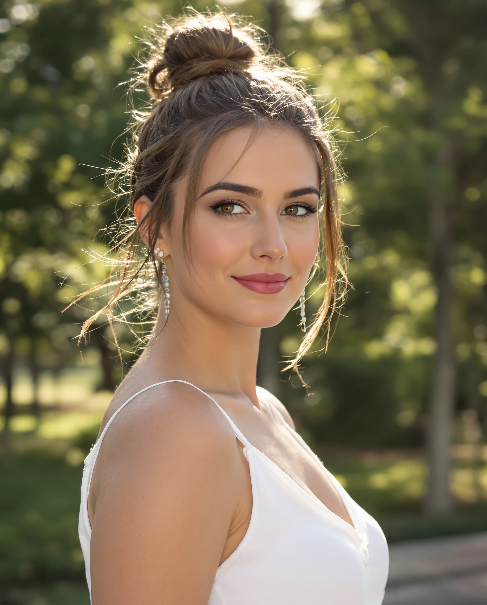 (dark brown hair in a messy bun, a few loose strands moving in the breeze:1.1)