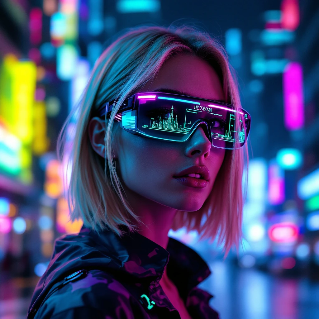A futuristic digital illustration features a woman wearing augmented reality glasses in a vibrantly neon-lit urban night scene. The woman is looking, not talking, just looking. The composition of the image is centered on the female figure, which occupies the left corner of the screen space. The perspective is frontal, with a slight downward angle. The woman is the main figure, and the background, an urban scene, is blurred, giving emphasis to the protagonist. The background represents a nighttime city, with tall buildings and vibrant lights. There is a sense of movement and speed, suggested by the neon lights and vibrant colors. She sports a futuristic and cybernetic look, with augmented reality glasses that display neon green patterns, which look like moving data. Her shoulder-length blonde hair is well-defined, and her glasses and accessories are highly detailed, with modern visual effects and bright colors. She is wearing a dark jacket, with visible patterns in shades of purple and neon green, and her skin has a texture that makes it look like a metallic and synthetic material. The art style is predominantly digital, with an emphasis on graphics and lighting. The vibrant colors and neon lighting in the background contribute to the futuristic atmosphere. The rendering technique appears to be digital, with a focus on the detailed representation of visual elements, creating an interesting contrast between the character's elements and the background elements. The environment is a modern city at night, with tall buildings and colorful lights that create a dynamic and technological atmosphere. The lighting is highly saturated and contrasted, with a wide range of vibrant colors, mainly greens and blues. The atmosphere is futuristic, vibrant and dynamic, with an undertone of energy and technology. The lighting highlights the female figure, making her the center of attention, while the background colors create a counterpoint that complements the central figure and intensifies the futuristic feeling.