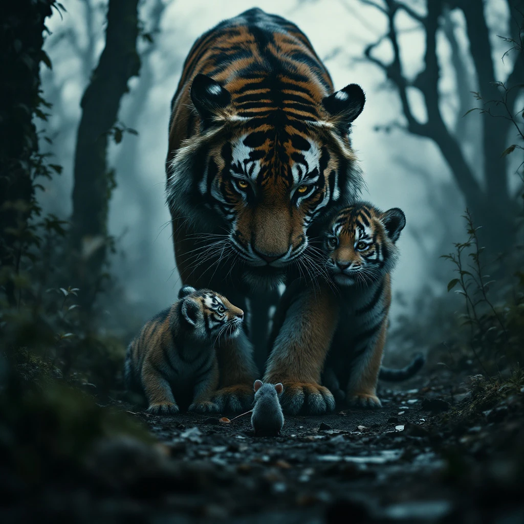 movie poster, A tiger and two tiger cubs, and a small mouse. , in the style of yoh nagao, light-focused, broken, absolutely alone, calm, heartbreaking brutal composition, dark, horror, gloomy, darktones, unforgettable, emotional depth, very intricate, leaving an indelible and haunting impression on psyche,Embrace together