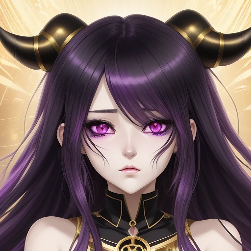 A goddess unique anime girl. blak hair. two purple horns. hair over right eye. beautiful Gold eye. tear running down face.