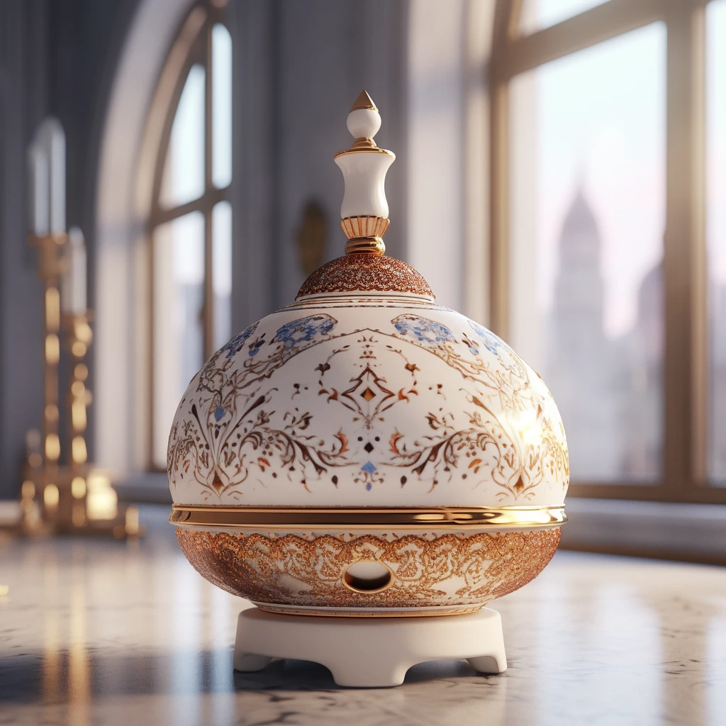 Aroma diffuser, inspired by the intricate, ornate designs of the Taj Mahal, with a marble exterior and intricate floral engravings, detailed, in style of artstation, digital art, hyper detailed, hyper realistic, white background, unreal engine, png 8K, depth of field, --ar 1:1