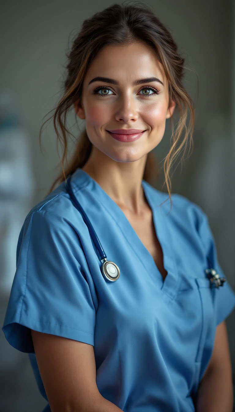 A compassionate and tender portrait of a caring American nurse. She's portrayed in a quiet moment, her gentle smile offering comfort and solace. She's dressed in her uniform, her hair neatly pulled back, with a sense of calm and composure. The image has a soft, humanist feel, influenced by classical portraiture, with a focus on conveying kindness and empathy.