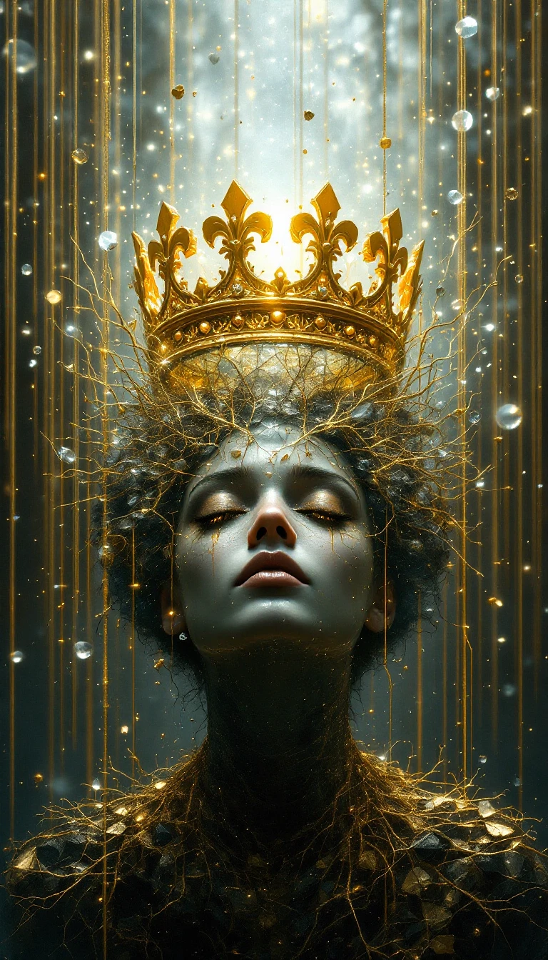 A **surreal and symbolic masterpiece** depicting **the burden of leadership**, visualized through an **ethereal, dreamlike composition**. At the **center of the scene**, an **impossibly heavy crown**—a fusion of **molten gold, fractured stone, and delicate glass**—**floats just above the head of an unseen figure**, radiating an aura of **divine weight and immense responsibility**.
