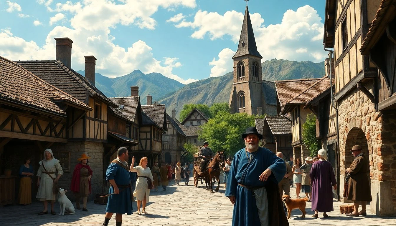 a medieval village scene, showcasing a bustling street with people and animals going about their daily business. A man in a blue tunic and black hat stands in the foreground, accompanied by a woman in a white dress and a dog. A group of people in various attire, including tunics, dresses, and hats, are scattered throughout the street. A horse-drawn cart is visible in the background, with a man standing beside it. The buildings are made of stone and have steeply pitched roofs, with half-timbering on some of the structures. A large church with a tall steeple dominates the background, surrounded by smaller buildings and trees. The background features a mountain range with a blue sky and white clouds. The lighting is bright and sunny, with long shadows cast by the buildings and people. The overall style is reminiscent of a Renaissance-era painting, with intricate details and textures.