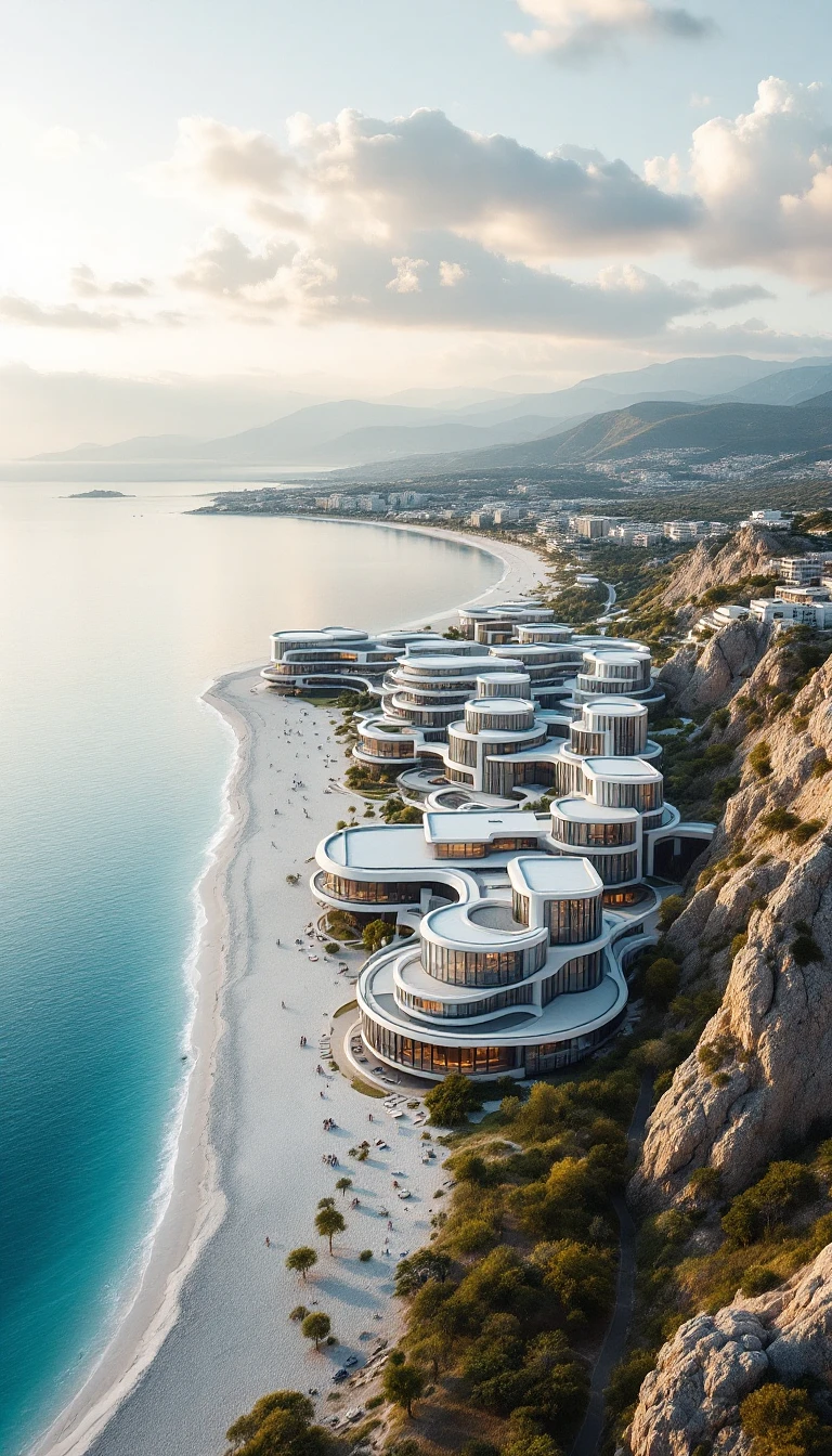 Ultra-realistic aerial cinematic view of Crimean coastline, focusing on modern luxury hotel complex. Minimalist architectural design with clean, geometric lines and flat white/gray roofs. Sleek contemporary buildings with glass facades, seamlessly integrated into coastal landscape. Pristine waterfront with architectural precision, minimal landscape intervention. Scandinavian and Japanese minimalist design influence. Sharp architectural lines, maximum transparency, neutral color palette - whites, grays, soft concrete tones. Modern infrastructure, subtle architectural bridges connecting buildings. Golden hour lighting with soft shadows, creating depth and sophistication. Hyper-detailed urban planning, 8K resolution, photorealistic architectural photography style. Emphasis on clean design, negative space, and architectural elegance. No traditional mountains, focus on smooth coastal terrain and cutting-edge architectural solutions.