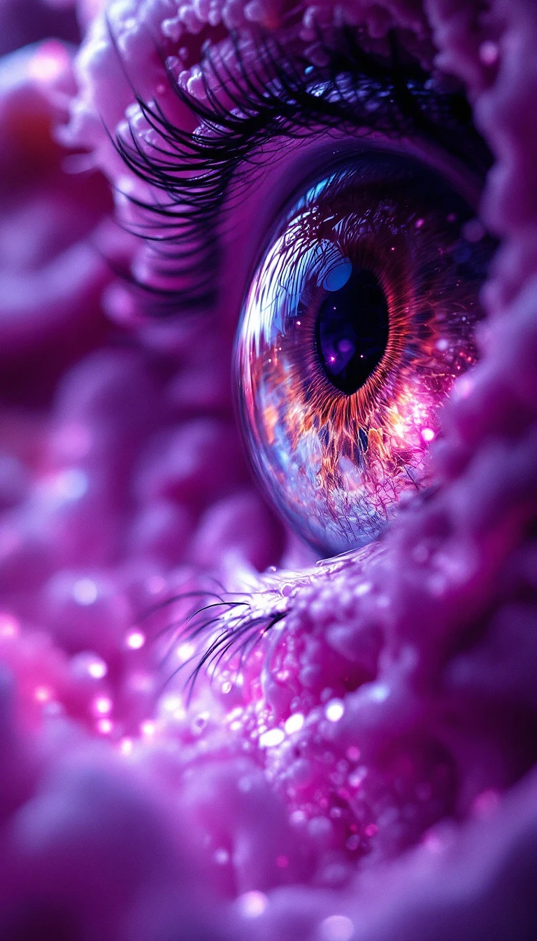 Close up of a mesmerizing Female abstract fractal macro complex angles, portal to female inner dimensions, ethereal lighting with duotone color shift magenta to deep purple transition.