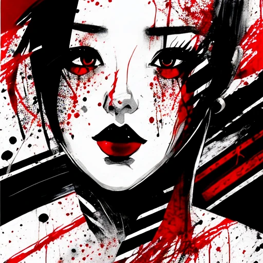 a painting of woman with red and black stripes, in the style of manga style, stark black and white, splatter paintings, use of screen tones, city portraits, heavy inking, digital