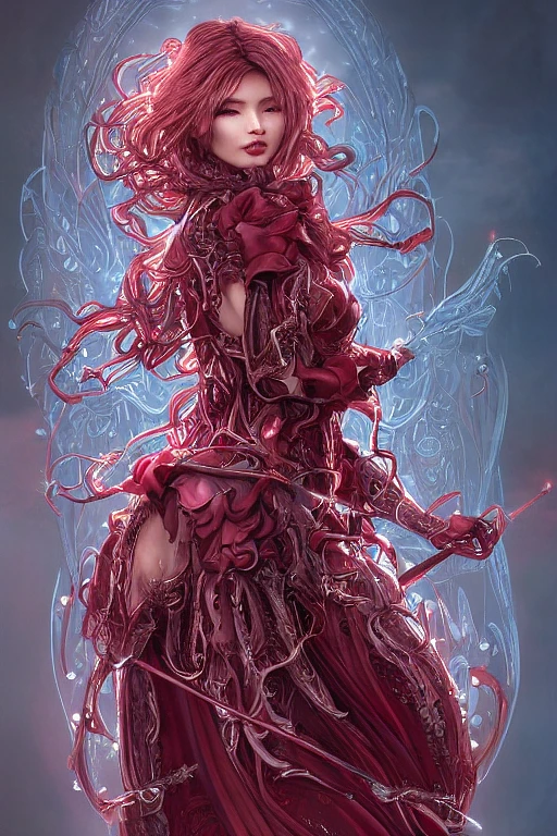 head and shoulders, highly detailed cdpr character design of armor witch 8 k metahuman, hajime sorayama, red long wavy red velvet rose, lace dress, artgerm, alphonse mucha, clear symmetrical face, game assets, swarovski, unreal engine, sharp focus, jewelry iridescent, illustration, artstation