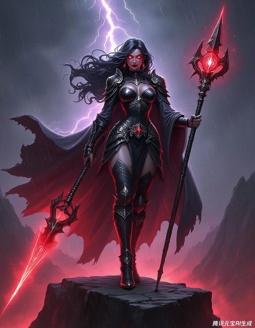 A sensual dark sorceress standing on a cliff during a thunderstorm, with glowing red eyes, revealing gothic armor, long flowing black hair, and a staff radiating crimson magic -- style of Genzoman -- highly detailed, 2D digital art, dramatic lighting -- aspect ratio 4:5