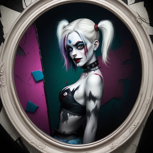 "Harley Quinn, in the style of a Tim Burton illustration, gazing into a cracked mirror, chaotic background, vibrant colors, exaggerated makeup, twisted smile, dark and whimsical atmosphere --s 150 --ar 16:9"