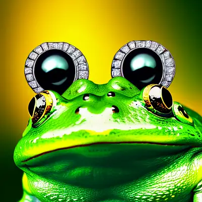 one fat frog with lots of jewelery on it, pearls, diamonds, gold, filigre, rubys, fantasmal iridescent, digital painting , volumetric light, cartoonish, extremely detailed, fantasy, intricate, 8k