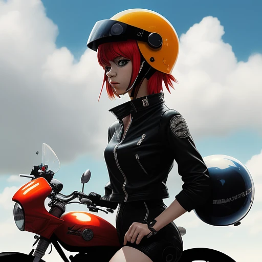 a man wearing a helmet, digital art, inspired by Eiichiro Oda, pixiv, digital art, madison beer as leeloo, picture of a female biker, discord profile picture, skies