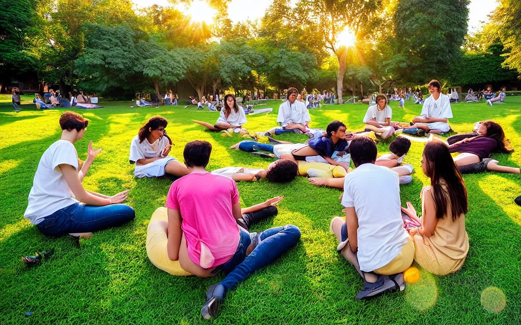 In a sprawling medical university campus, bathed in the warm embrace of the golden afternoon sun, a picturesque scene unfolds. Nestled amidst a verdant oasis, five exuberant medical students, all in their twenties, find solace and inspiration on the plush grass. They form a tight-knit circle, their camaraderie palpable. Seated at the heart of this lively gathering, a young woman cradles a sleek laptop upon her thighs. Her eyes dance with an intensity fueled by her pursuit of knowledge, as she delves into the depths of medical research, her fingertips navigating the keyboard with effortless grace. The glow of the screen casts an ethereal illumination on her face, highlighting her dedication and curiosity. To her right, another student playfully engages with a mischievous feline companion. A graceful cat, with sleek ebony fur and captivating emerald eyes, confidently weaves its way between textbooks and scattered notes. The student, temporarily distracted from the tomes of medical wisdom, revels in the pure joy of feline antics. Their laughter resonates harmoniously, a harmonious counterpoint to the surrounding tranquility. Meanwhile, the remaining trio of friends engross themselves in their studies, their fingers tracing the intricate illustrations of anatomical wonders in aged textbooks. They lean in, heads bent together in deep concentration, their expressions a testament to their intellectual fervor. Amidst the collective pursuit of knowledge, the fluttering pages of their books whisper tales of discovery and ambition. Beneath the sheltering canopy of ancient trees, their lush foliage creates a breathtaking canopy, casting intricate patterns of shade and sunlight upon the students. The vibrant hues of green interplay with the gentle breeze, creating a symphony of nature's embrace. As the scene expands beyond the immediate circle of friends, the campus comes alive with the harmonious rhythm of learning. Peering between the foliage, glimpses of fellow students engaged in animated conversations or engrossed in their studies can be seen. Their diverse backgrounds and aspirations add vibrant hues to the tapestry of academia, showcasing the multifaceted nature of medical education. A sense of divine serendipity graces the scene as a benevolent deity observes the students' endeavors from a secluded vantage point. Clad in flowing robes that ripple with the energy of the cosmos, the deity radiates a subtle aura of guidance and inspiration. Their presence, although distant, infuses the air with an intangible power, nurturing the students' aspirations and fueling their relentless pursuit of knowledge. The image, rendered in breathtaking 3D realism, captures the essence of youth, friendship, and intellectual curiosity. It encapsulates the vibrant energy of the medical university, blending the beauty of nature, the joy of companionship, and the earnestness of scholarly endeavors. Every detail is meticulously crafted, from the sunlight filtering through the foliage to the intricate expressions of each student. This masterpiece stands as a testament to the boundless potential of the human spirit and the pursuit of excellence.