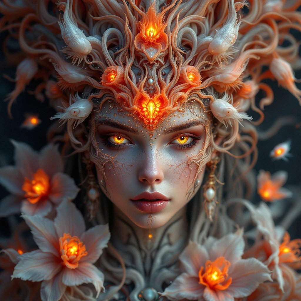 Goddess close-up portrait ribcagel. jellyfish phoenix head, nautilus, orchid, skull, betta fish, bioluminiscent creatures, intricate artwork . octane render, trending on artstation, t symmetrical artwork. cinematic, hyper realism, high detail, octane render, 8k