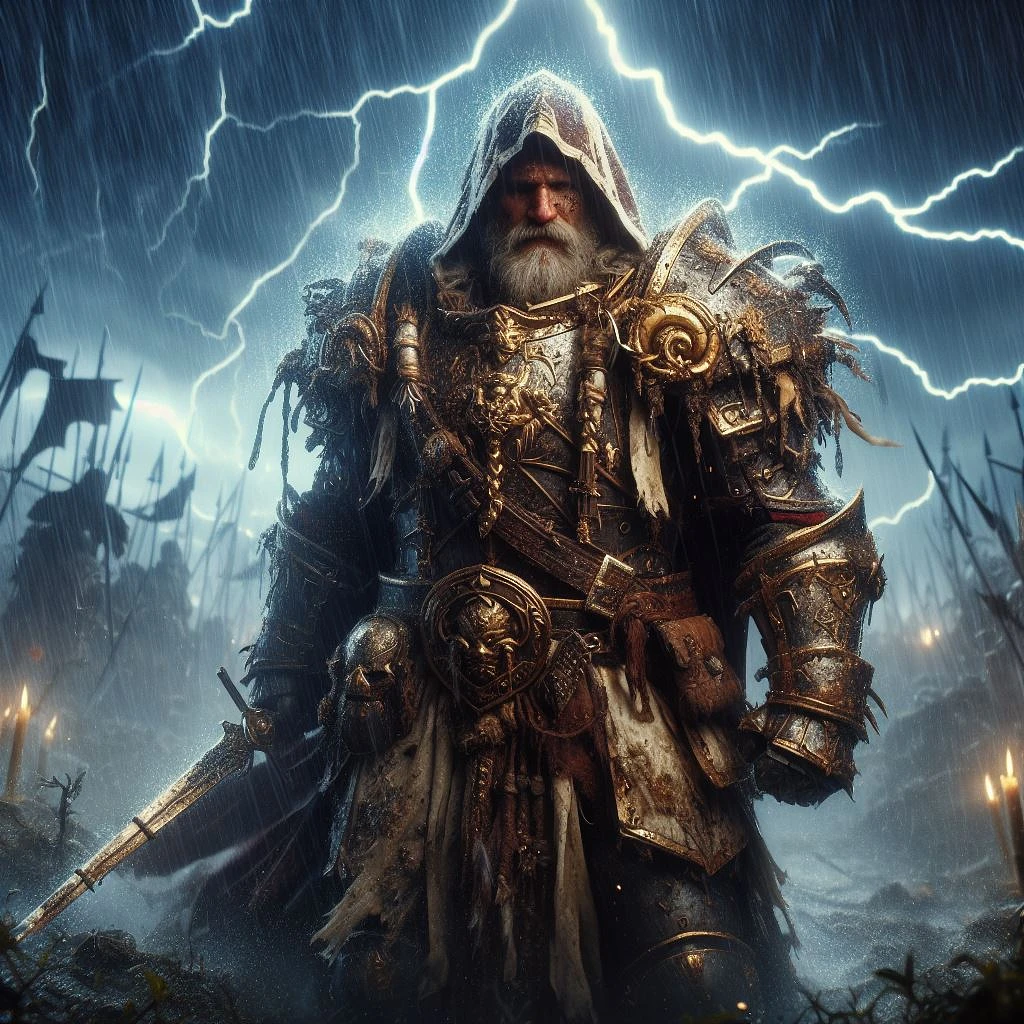 Amidst the chaos of a rain-soaked battlefield, Alaric, a battle-hardened dwarven knight, stands resolute in his ornate, weathered armor. The dynamic interplay of lightning and thunder illuminates the scene, casting dramatic, high-contrast light on the mud-splattered plates and the grit-filled crevices of his war-torn attire.