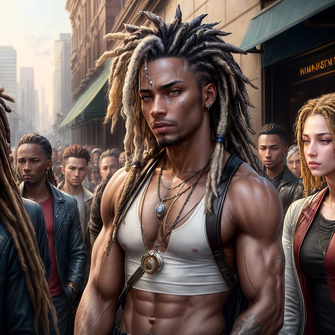 epic realistic, a cartoon avatar with short dreadlocks, in the style of hyper-realistic atmospheres, detailed crowd scenes, cobra, american barbizon school, realistic detail, movie still, manticore, (Masterpiece:1.3) , (best quality:1.3) , <lora:add_detail:0.4> <lora:epi_noiseoffset2:0.4> <lora:hairdetailer:0.6> <lora:more_details:0.3> <lora:add-detail-xl:1.2> <lora:DetailedEyes_V3:1.2> <lora:sd_xl_offset_example-lora_1.0:1.2> , (natural skin texture, hyperrealism, soft light, muted colors) , background, rutkowski, rim light