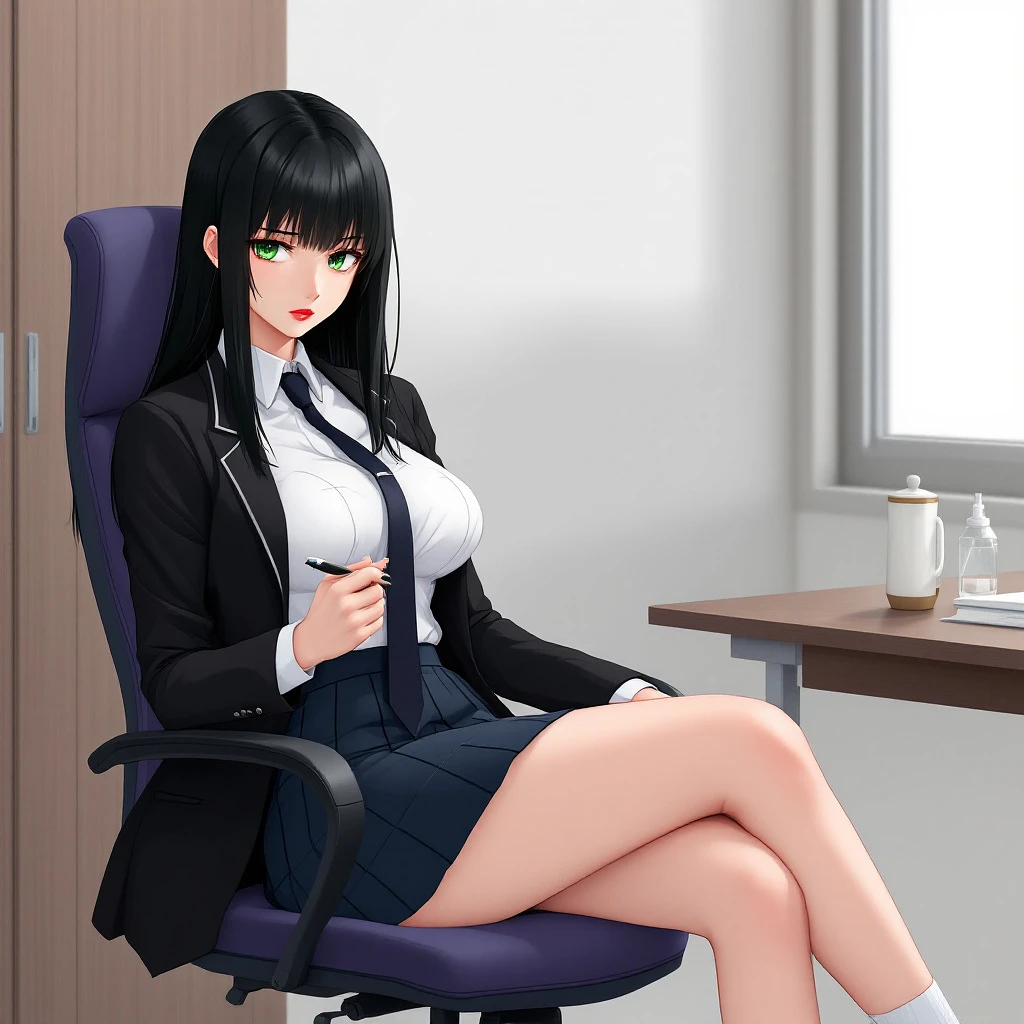 anime, woman, black hair, long hair, green eyes, red lips, white shirt, black tie, black blazers, tight blazers, short dark blue skirt, highschool skirt, white socks, black shoes, bored expression, big chest, sitting on a chair at an office, sitting with legs crossed, skinny belly, holding a pen