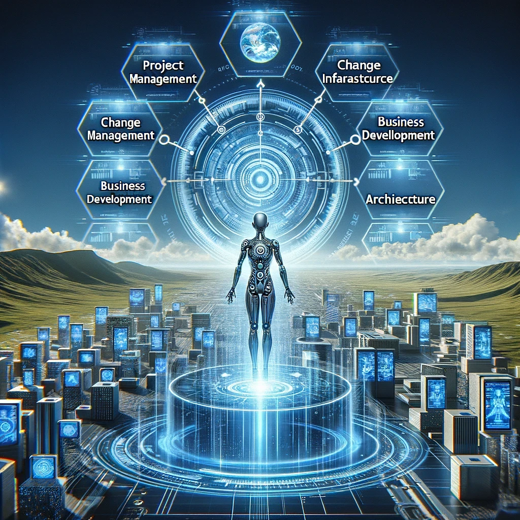 Create a futuristic AI landscape with clear labels of tech roles. The image should visually represent a central AI model overseeing the areas, - (Prompt description under progress )