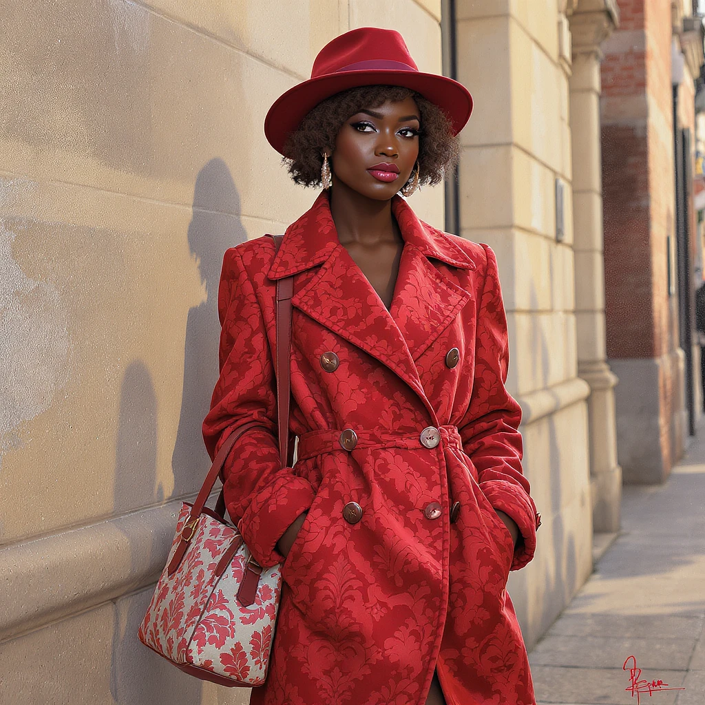 A full-body acrylic highly detailed image of an African American female with brown short curly hair. She is wearing a stylish RED damask coat with intricate patterns, and a matching fedora hat that adds a touch of elegance. She carries a damask tote bag, complementing her outfit. The background is a city street with a soft, warm light casting gentle shadows, highlighting her fashionable appearance.
