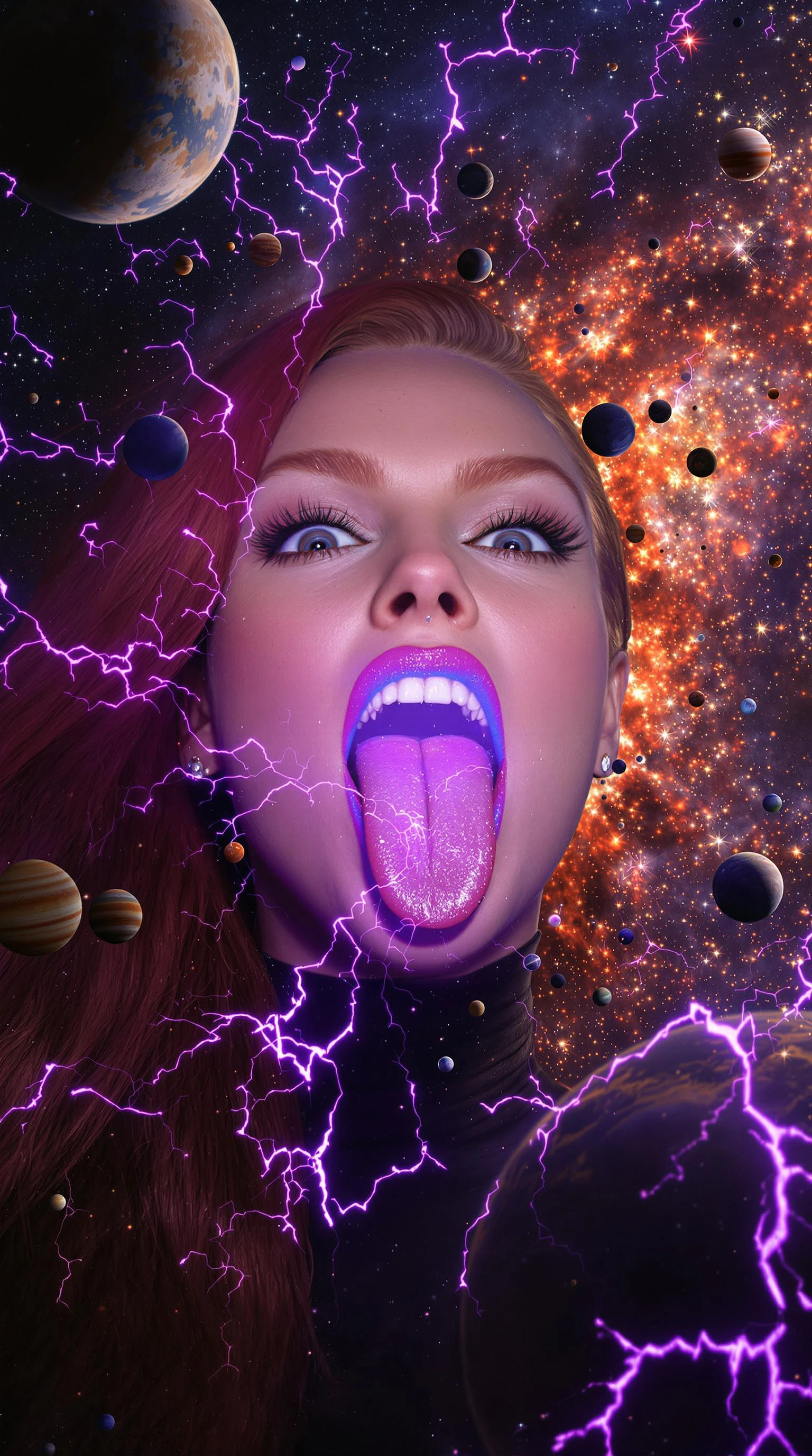 64K glossy photograph of redheaded enormous giantess 18 year old Redheaded Laura Prepon, Donna from That 70's Show, seen bigger than a galaxy floating in space, minuscule planets in front of her mouth, a smug salacious smirk on her face, very low angle extreme zoomed in close up of her mouth as she looms over the planet, flexing her muscles, eyes open and glowing like the embers of a fire, neon blue lipstick, straight, long length red hair, side angle, muscular, sticking her pierced tongue out as if to lick a popsicle, thousands of planets and moons flying around her face, purple electricity and energy surrounding her photo-realistic hyperbole 64K uhd photograph, highly intricate details