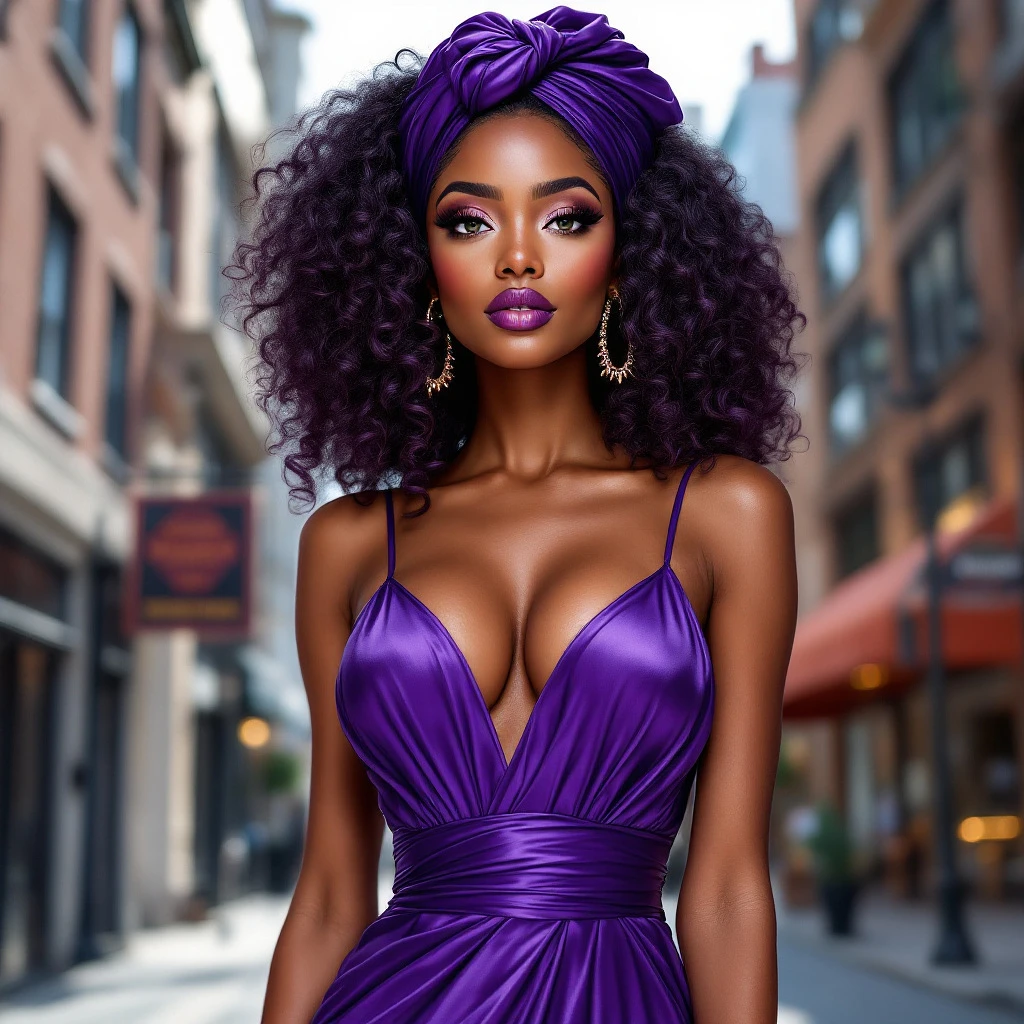 A full length head-to-toe view of a 4k airbrushed hyper realistic glossy illustration of a stunning African American woman with captivating hazel green eyes, prominent lashes, and well-defined brows. Her glossy, deep purple curly hair is adorned with an elegant deep purple headwrap, adding a touch of sophistication. She is dressed in a stylish purple swirl dress with a deep neckline, and matching spike heels. She is standing face forward in front of a downtown building. The image is isolated on a pristine white background, ensuring the focus remains on her and fits perfectly within the border.