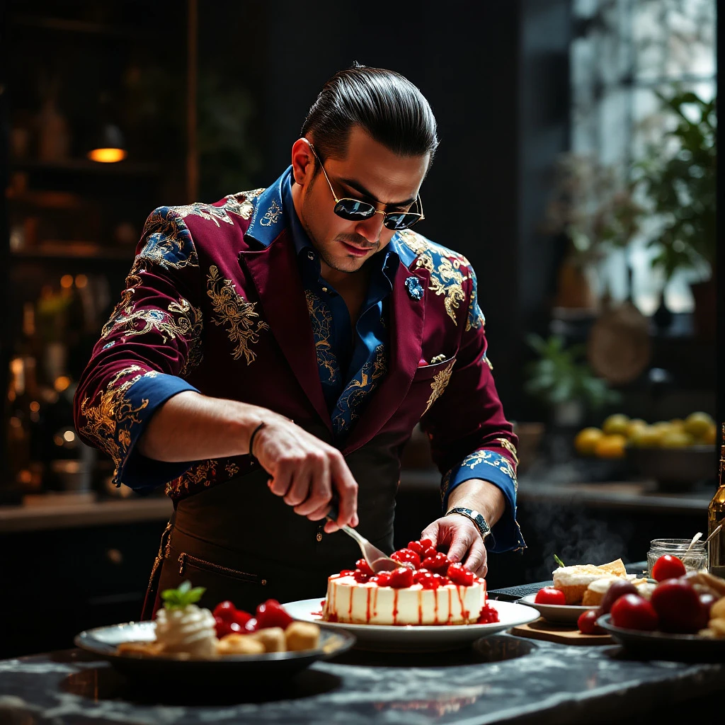 a yakuza wearing a burgundy suit and a versace shirt in blue wearing an apron and is cooking dessert