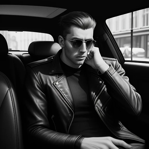 Black and white street photography of an attractive man in leather jacket inside car, on the streets of London, shot by arriflex 35 BL Camera Canon K35 Prime Lenses --ar 1:2 --stylize 750