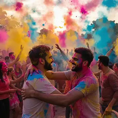 "A vibrant and colorful Holi scene with a joyful Indian festival vibe. A group of young men and women are dancing energetically with bright smiles, faces covered in pink, blue, yellow, and green gulal. A man in the center is holding a large dhol and playing it enthusiastically, while others around him are throwing colored powder into the air. A woman in a white dress stained with bright colors is laughing with her hands raised. The background features a street packed with people celebrating, colorful smoke in the air, and sunlight creating a glowing effect. Overlay bold, bright yellow and pink text with a black outline that reads 'πŸ”₯ Holi ka Sabse Bada Dhamal! 🌈' at the top, and smaller white text at the bottom that says 'Bura Na Mano Holi Hai! ' Add festive elements like pichkaris, flower petals, and a subtle image of Radha-Krishna in the background for a spiritual touch. "