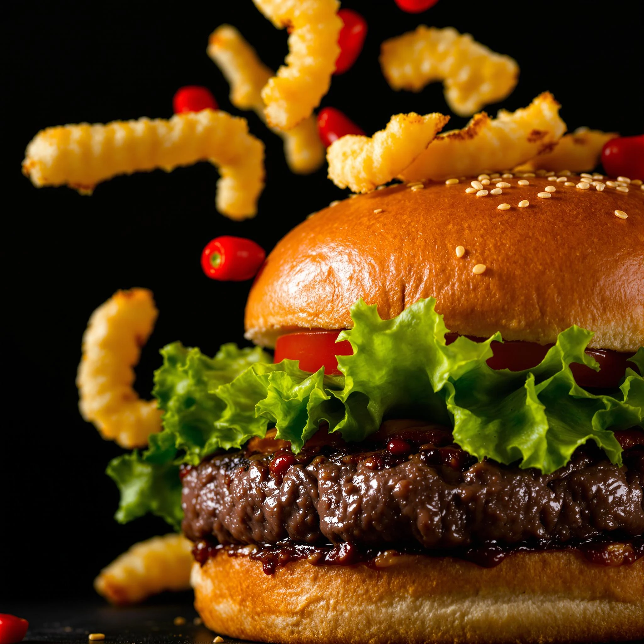 A close-up of a gourmet burger with a juicy beef patty, lettuce, tomato, and a sesame seed bun. Crinkle-cut fries and small red peppers are captured mid-air, falling onto the burger. The background is dark, highlighting the vibrant colors and textures of the food. The composition is dynamic and appetizing, emphasizing the fresh ingredients and dramatic presentation.
