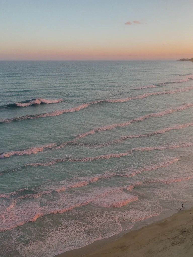 Uma vista serena da praia ao pôr do sol, ondas calmas tocando a areia, céu tingido de tons rosa, roxos e laranjas, silhuetas de pessoas caminhando na praia, evocando paz e contemplação, Pintura, tinta acrílica em tela, --ar 16:9 --v 5