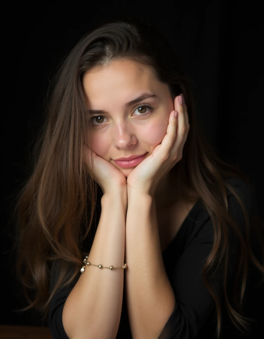 A [young] woman with [long, wavy brunette hair] rests her head on her clasped hands, she is looking in the camera. She is dressed in [a black top] and wears [a delicate bracelet on her left wrist] . Her expression is [gentle and thoughtful] , enhanced by [natural makeup and a hint of pink lipstick] . The background is [dark and blurred] , drawing attention to [her face and hands] .