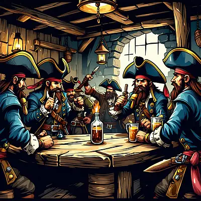 pirate captain, dockhand in rags, brawling with firearms and rum mugs in a tavern. comic style with sharp, thick lines