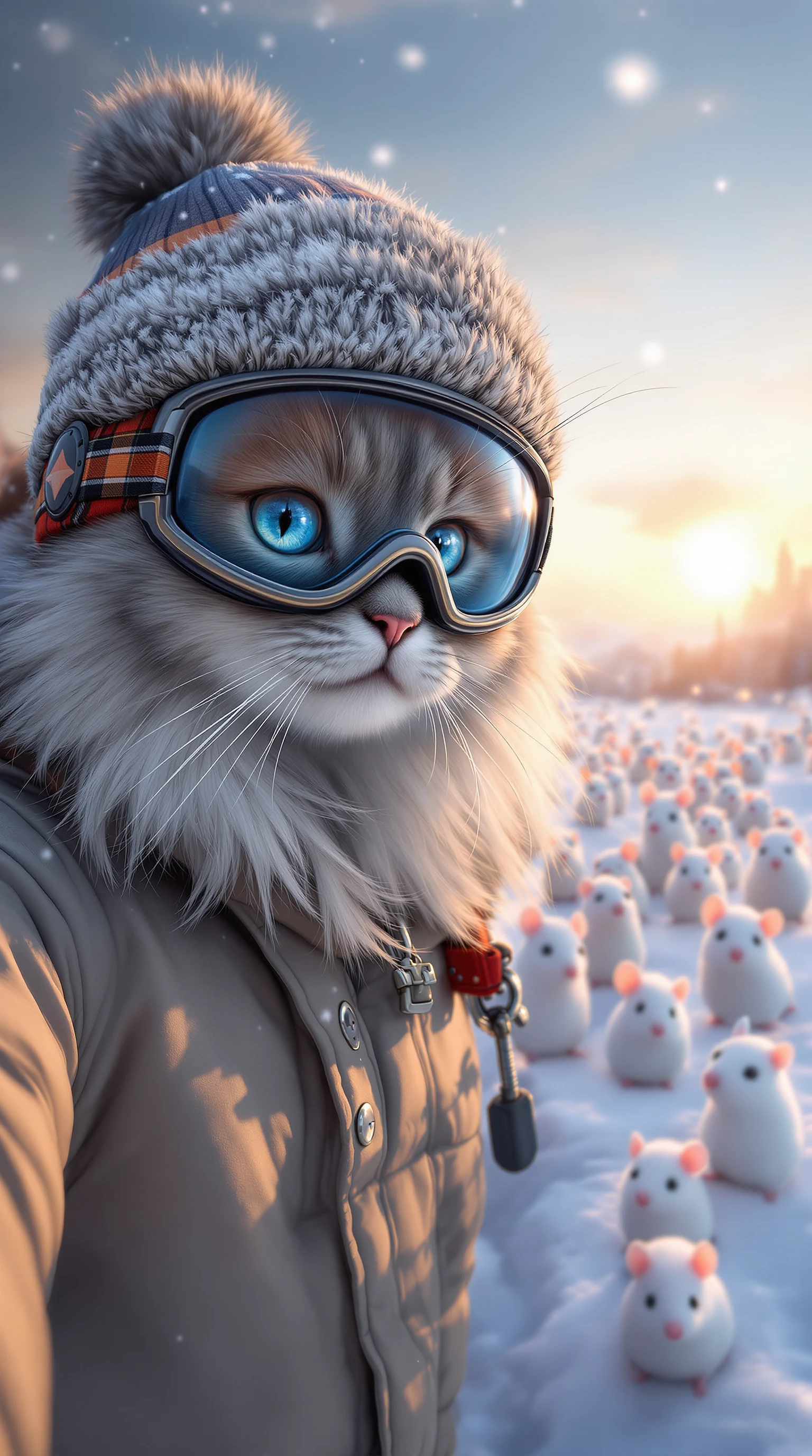In the snow, there is an ice field with many mice standing on it. A real cute persian cat wearing SKI MASK and SNOW jacket and WOLLY hat takes a selfie in front of them. The cat has big blue eyes, long grey fur, surrounded by more than ten small white mice, in the style of sunset light, hyper detailed