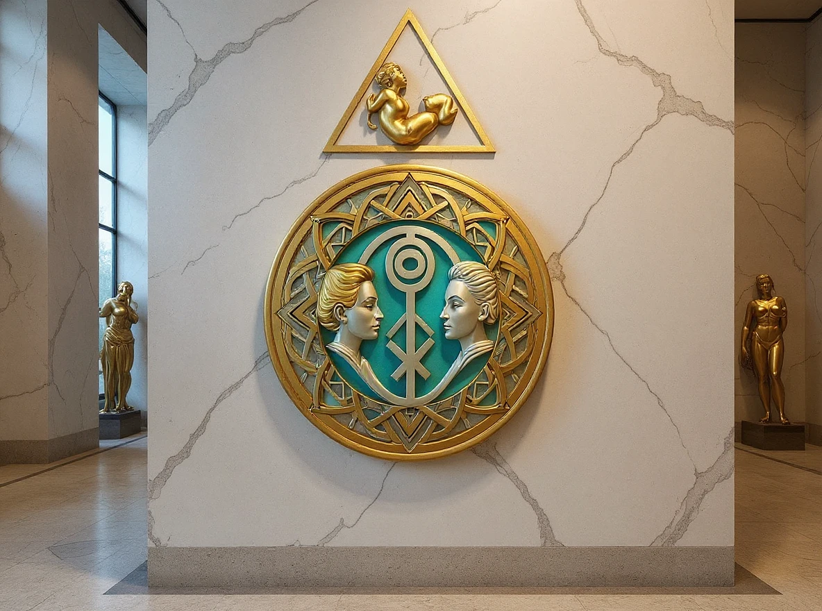 Photo. in the Musea wall of Marmer. On top a golden golden triangle with one golden big diamant and a erotic image on a wall of white marmer, in a Temple background WITH one Woman erotic statues, in the biggest art Musea of all time, the statues of the two two female angels making 69 intence love in gold -- real prof photo -- high res.