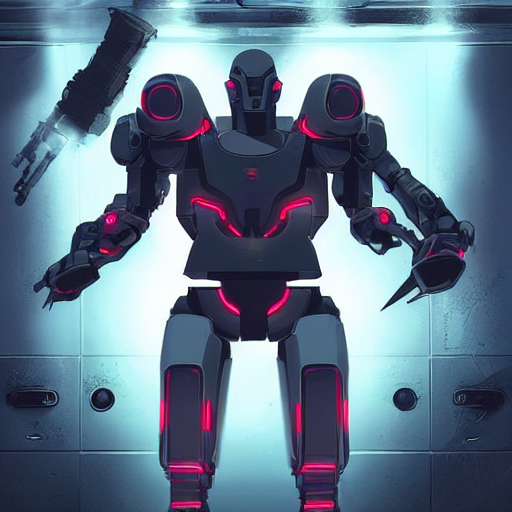 Character concept art, grey metallic muscular robotic soldier, futuristic militant mech, glowing red eye, future fantasy, digital animation, ghost in the shell animation style, poster, neon effects, symmetric lights and smoke, clean room, de-noise, symmetrical composition, high detailed, bold shūji, style of Laurie Greasley and Satoshi Kon, 8k —ar 10:16 —q 2