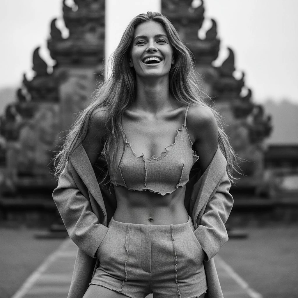 Brutalist high Fashion waist up photo of a 20-year-old with extreme blond long hair Slim female with Joyful laughter expression. Her body is Lean, sculpted back slim that taper to a slim waist, toned , a, small breast, flat chest. She has Smooth skin with a natural shine, especially around the cheekbones. The skin pores and texture are clearly visible and in focus. Her hair color is dark Blond extreme long hair. Her outfit is Raw material texture top, She poses in She stands with her feet apart, hands tucked into the pockets of her jacket, and gazes confidently into the distance, embodying urban cool. . in the background Bali, Diffused in the style of Bruce Weber