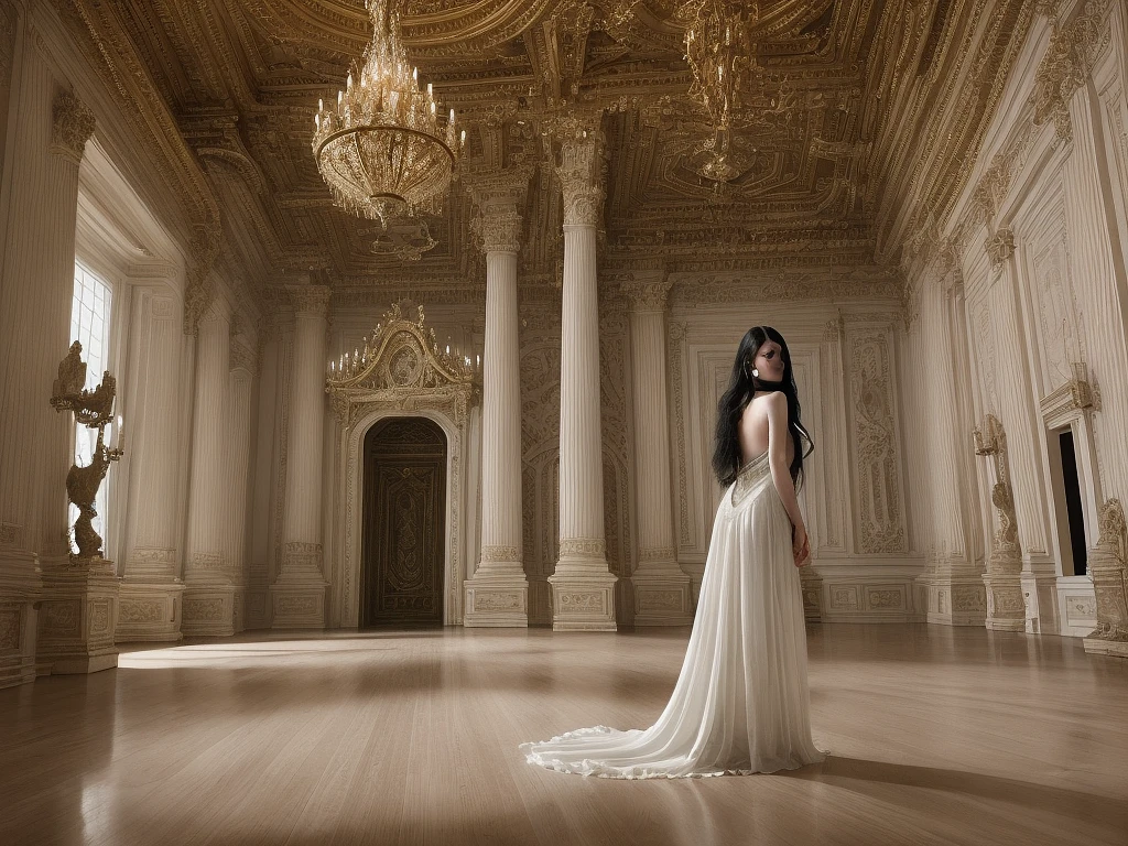a breathtaking portrait of a woman with an ethereal aura, set against the backdrop of a grand, ornate room that seems to transport the viewer to a realm of fantasy and wonder. The woman stands serenely, her long, dark hair cascading down her back like a waterfall of night. Her attire is a masterful blend of elegance and sophistication, featuring a stunning white dress adorned with intricate gold accents that seem to shimmer and shine in the light. The dress is further embellished with sparkling blue gems that add a touch of luxury and glamour to her overall appearance. A delicate gold necklace graces her neck, complemented by an elegant gold bracelet that adds a touch of refinement to her ensemble. Her dress features a high slit on one side, showcasing her toned leg and adding a touch of drama and flair to her overall pose. But the true showstopper is the pair of large, transparent, feathered wings that protrude from her back, giving her an undeniably angelic aura. The wings seem to glow with a soft, ethereal light, as if infused with an otherworldly energy. The background of the image is a grand, ornate room that seems to have been plucked straight from the pages of a fairy tale. Tall, golden pillars stretch up towards the ceiling, supporting a vaulted roof that seems to disappear into the heavens. A large, stained-glass window dominates one wall, casting a kaleidoscope of colors across the floor. To the left of the woman, a delicate, golden chandelier hangs from the ceiling, casting a warm, golden glow over the entire scene. The walls are adorned with intricate, golden filigree, adding a touch of opulence and luxury to the overall atmosphere. The overall effect is one of breathtaking wonder and enchantment, as if the viewer has stumbled into a magical realm hidden from the mundane world.