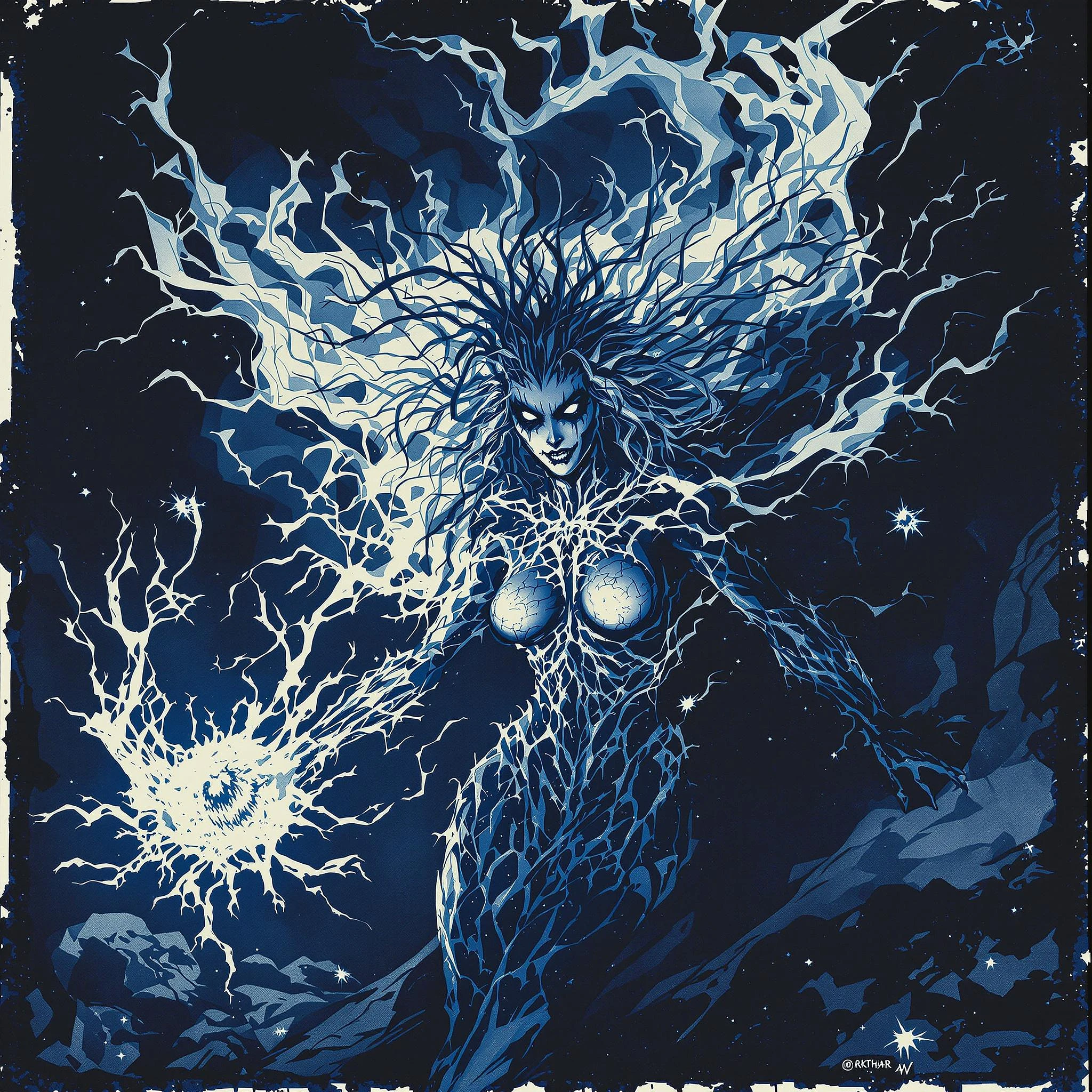 in cyanotype art style, Arkthar the chaos necromancer (female character) , spreading fear and confusion like the wind spreads the seeds of evil, masterpiece, in the style of detail-oriented. Horror and dark fantasy.