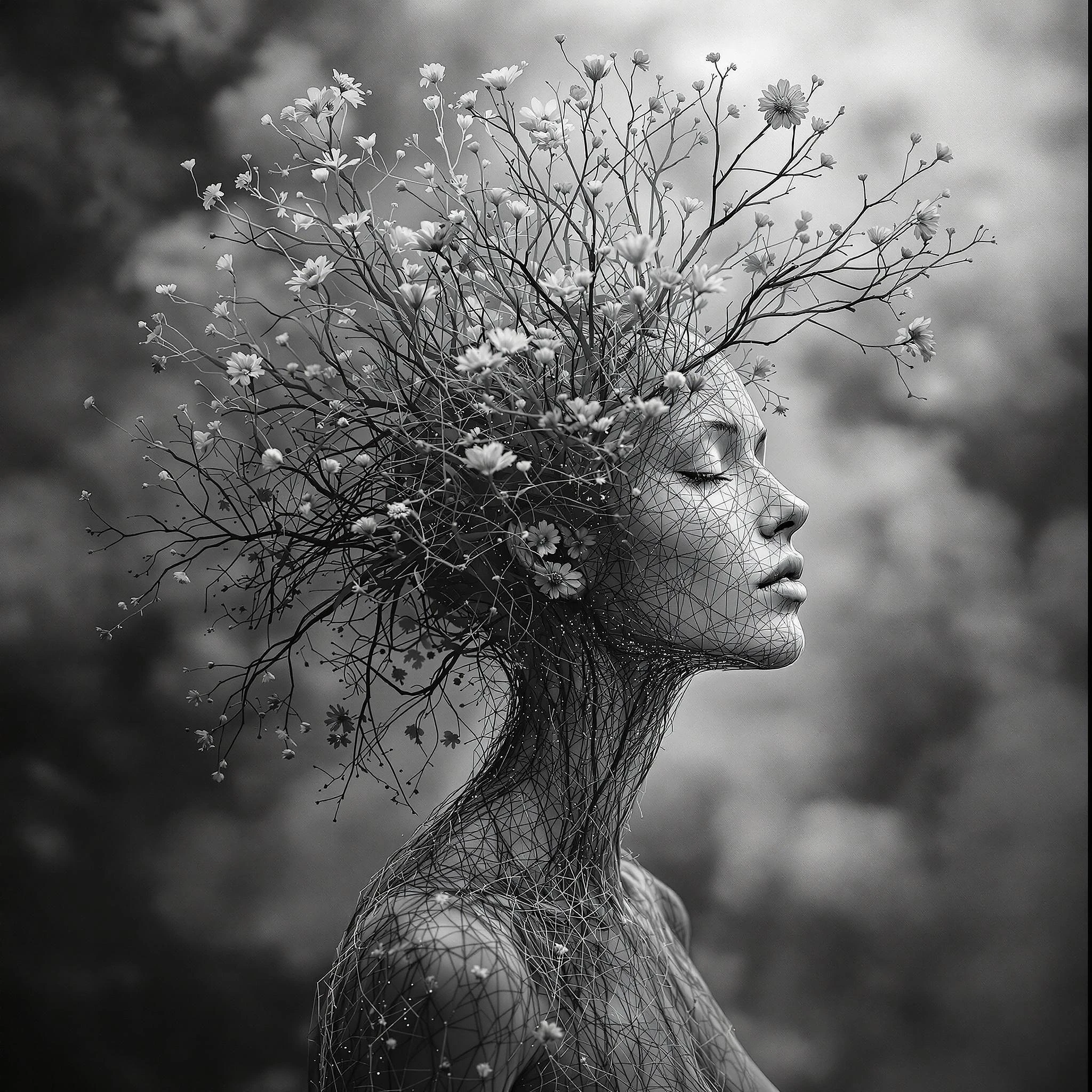 woman made of thin threads+ dried flowers, mysticism, + coherent, haze, fog, surrealism, volumetric soft light, 3d human and flower shaped branches, in the style of medical imaging film, detailed anatomy, intricate monochrome illustrations, michael eastman, rtx on, ballet academia